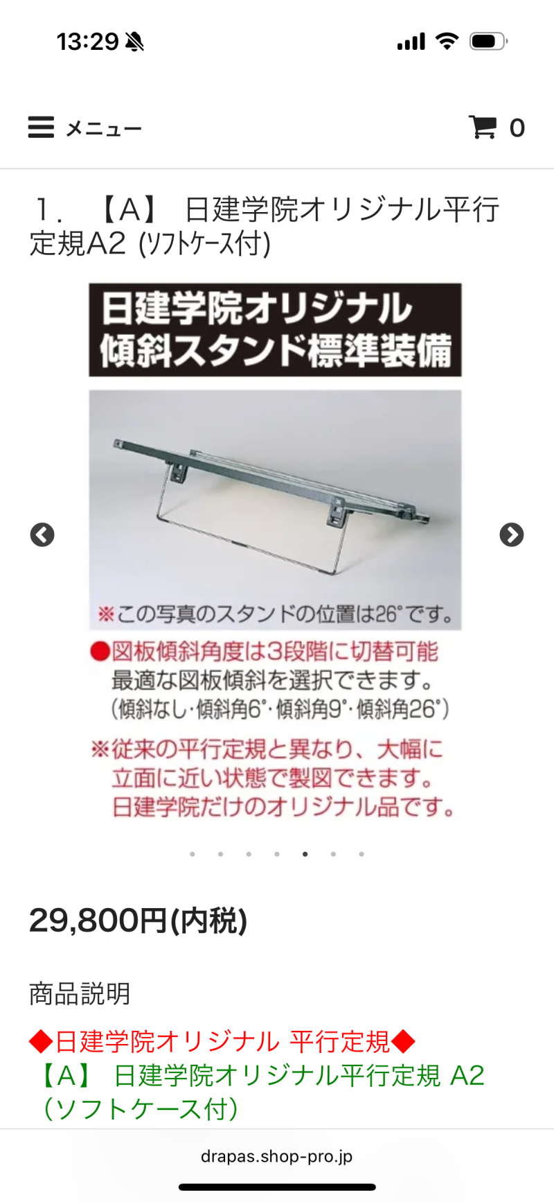 私は今もこの定規を使っていますが、日建オリジナルの平行定規は角度が26度までしっかり上がるので、日建で買えばよかったなとずっと憧れています。