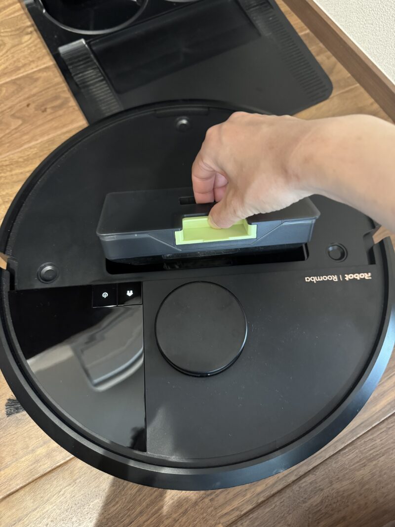 丸いルンバ本体の吸引したゴミが溜まるダスト容器を外してください。