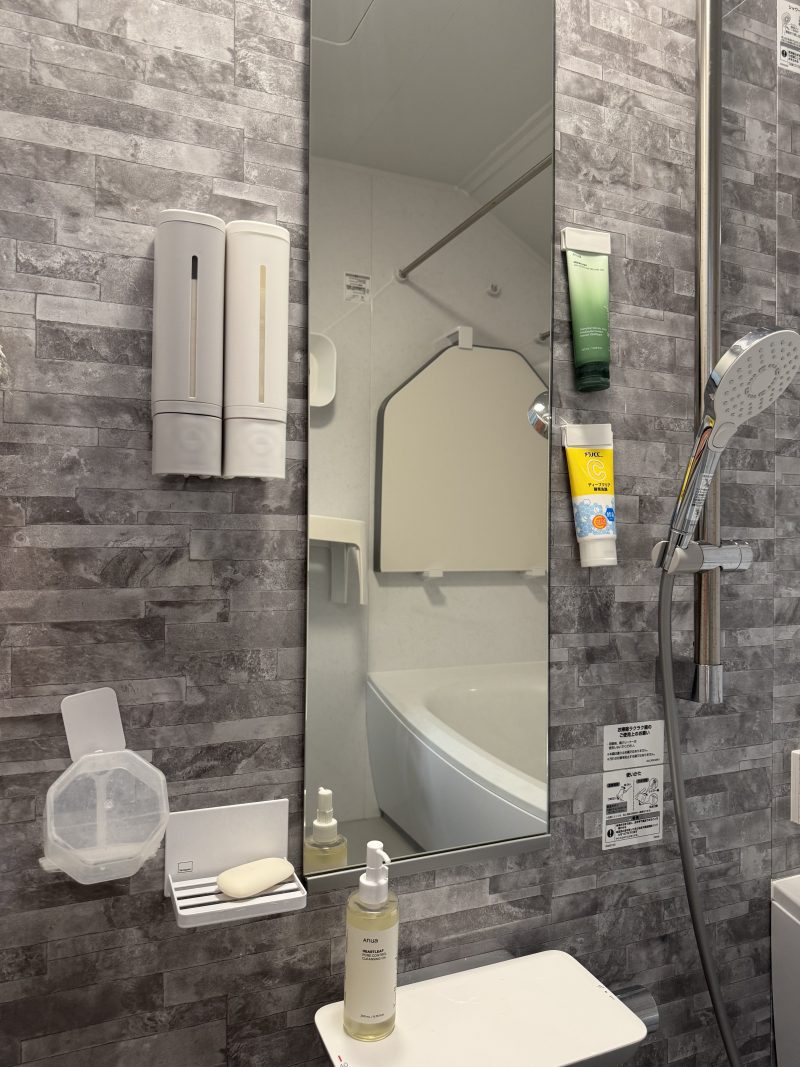 我が家では、これを機に壁付けディスペンサーを導入してシャンプー・リンスを詰め替えています。